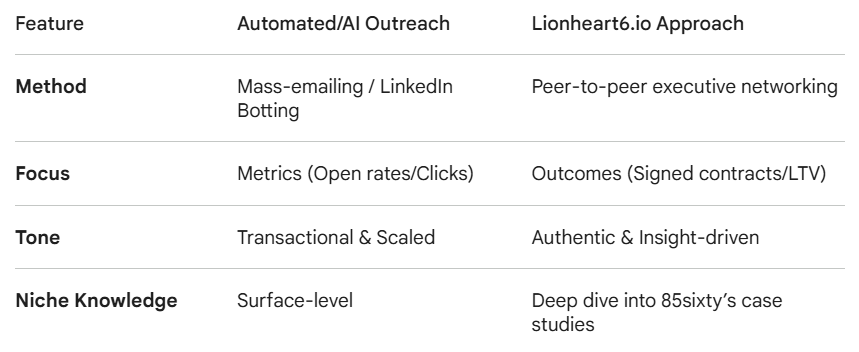 Lionheart 6 moves away from the "volume-based" treadmill. I recognize that 85sixty’s value lies in its deep expertise in DTC eCommerce and Travel/Hospitality. My approach centers on Strategic Relationship Development to penetrate these specific niches.
